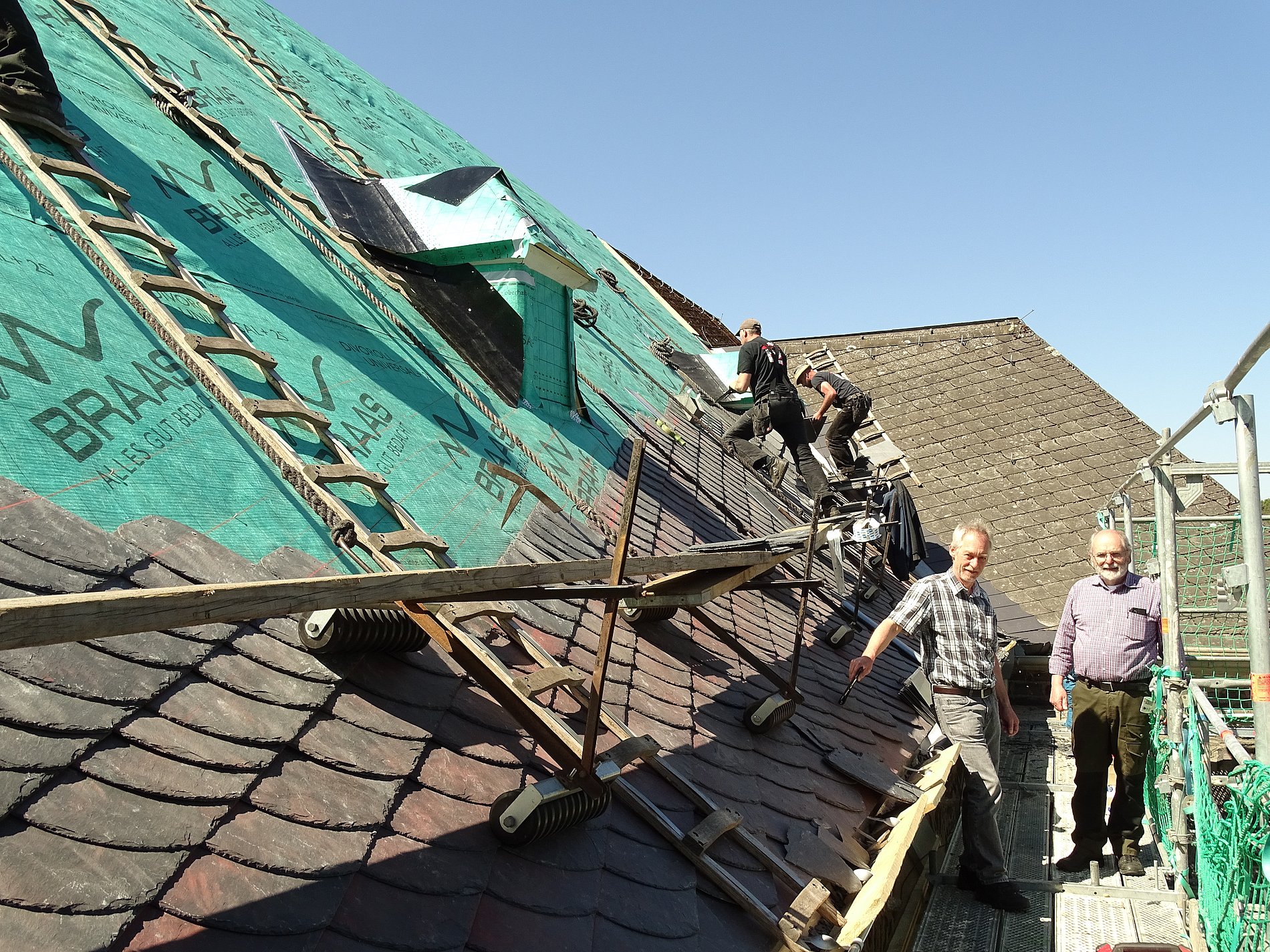 Rund 163.000,00 € sind laut dem Architekten Frensch für die Gesamtmaßnahme veranschlagt. Dem stimmte der Verwaltungsrat zu. Die Kosten übernimmt zu 90 Prozent das Bistum Limburg, 10 Prozent muss die Pfarrei tragen. Zunächst wird jedoch erst nur einmal das Hauptschiff der Kirche mit einer Fläche von rund 360 Quadratmetern neu eingedeckt. Auf die vorhandene Dachschalung aus Fichtenbrettern, die nicht die erforderliche Stärke aufwies, wurden nach Entfernung der alten Eindeckung zunächst eine weitere Schalung und eine Abdichtungsbahn aufgebracht. Die Eindeckung erfolgt auch jetzt wieder in Naturschiefer in ‚Altdeutscher Deckung‘. Im Dachgeschoss der Kirche, so der Architekt, mußte lediglich ein Balken ausgetauscht werden.