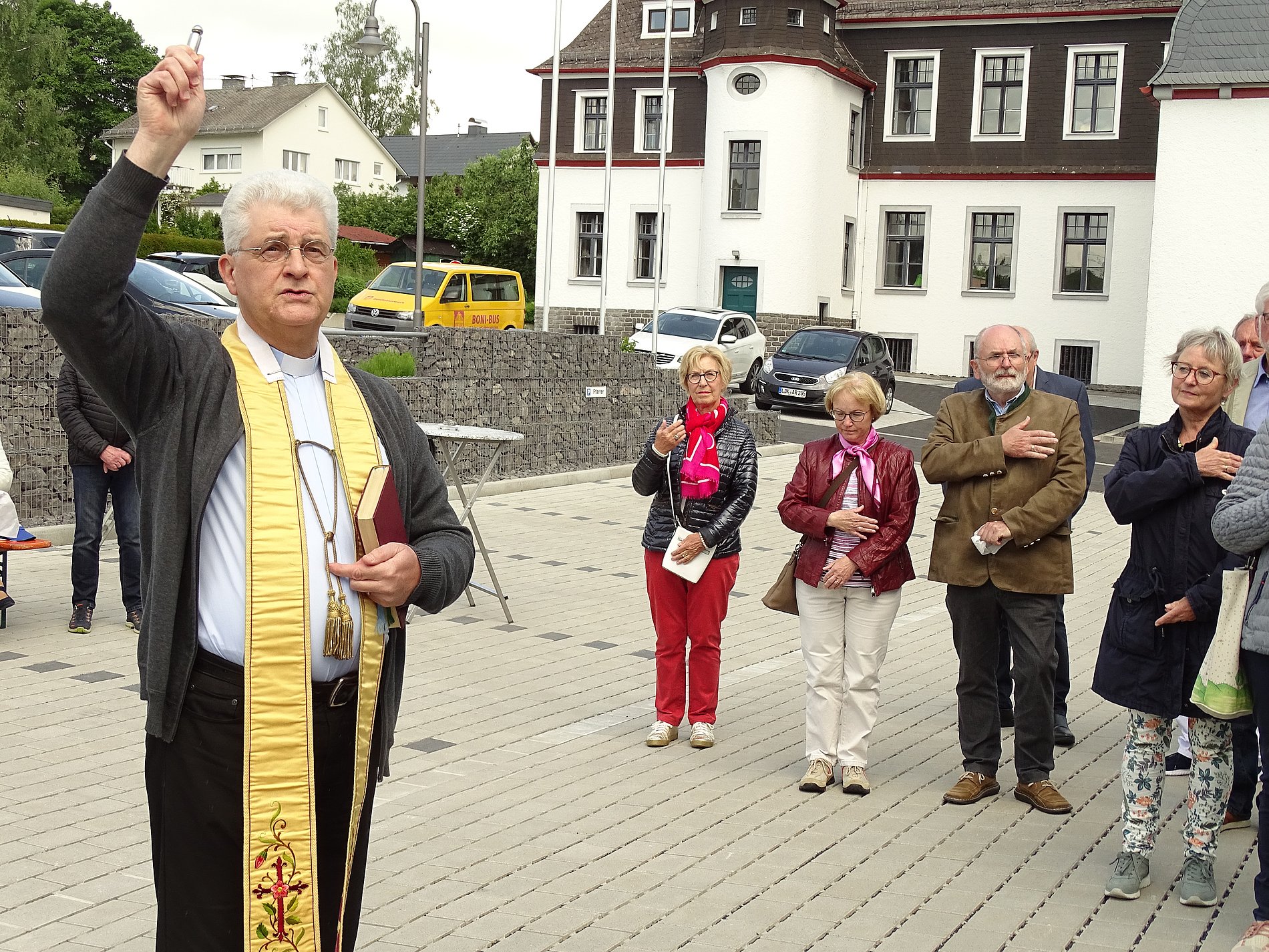 Pfarrer Achim W. Sahl erbat Gottes Segen für das neue Verwaltungsgebäude der Pfarrei Sankt Franziskus im Hohen Westerwald. Es schloss sich das „Großer Gott wir loben dich“ an.