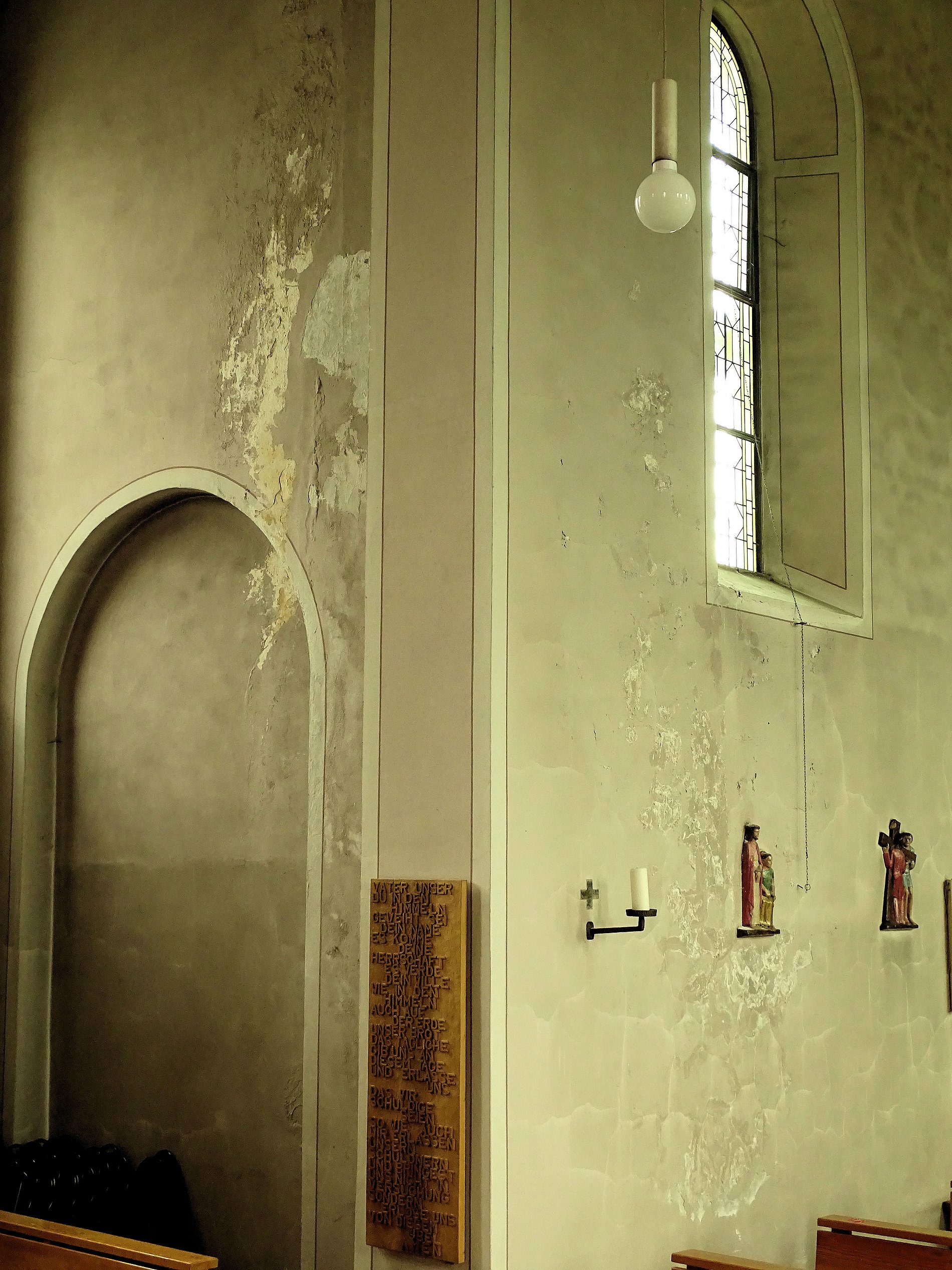 Seit Jahren zeigten sich, mit fortschreitender Dauer immer deutlicher, Risse und Aufblähungen am Innenputz, Farbe blätterte ab und rieselte zu Boden. Auch eine Fensterlaibung sowie eine Kreuzwegstation waren davon betroffen. Kurz, ein für ein Gotteshaus unwürdiger Zustand. In der Winterpause wurden diese Bereiche nunmehr von einem Fachunternehmen eingerüstet, die schadhaften Stellen ausgebessert und ein neuer Anstrich, anpasst an den bestehenden vorherrschenden Farbton, aufgetragen. Nach gründlicher Reinigung von entstandenen Staubablagerungen wurden die Arbeiten, pünktlich zur Wiedereröffnung der Kirche, abgeschlossen. Fotos belegen den desolaten Vorstand vorher und nach der Renovierung. Nunmehr hofft man im Kirchort Hellenhahn-Schellenberg auf eine weitere Renovierung der Wandflächen vom Kircheninneren in Sankt Petrus in Ketten.